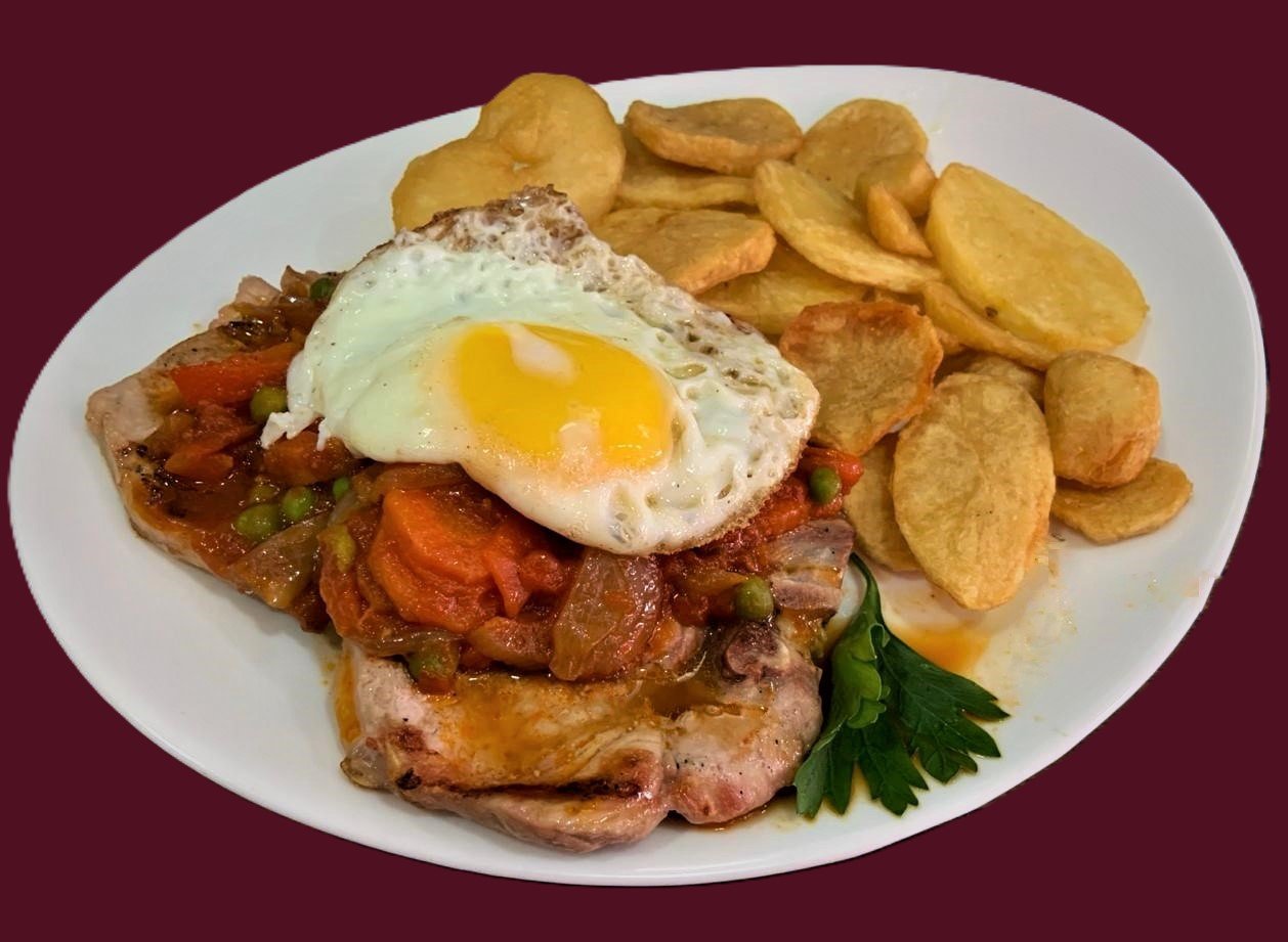 Costillitas de cerdo a la criolla (Salsa de tomate, papas, zanahoria, arvejas, morrón, cebolla y huevo frito)