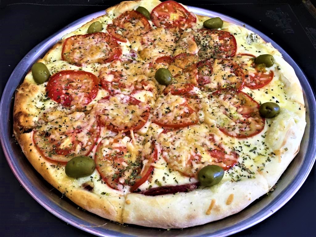 Muzzarella, salsa de tomate, rodajas de tomate, provolone, aceitunas, longaniza calabresa