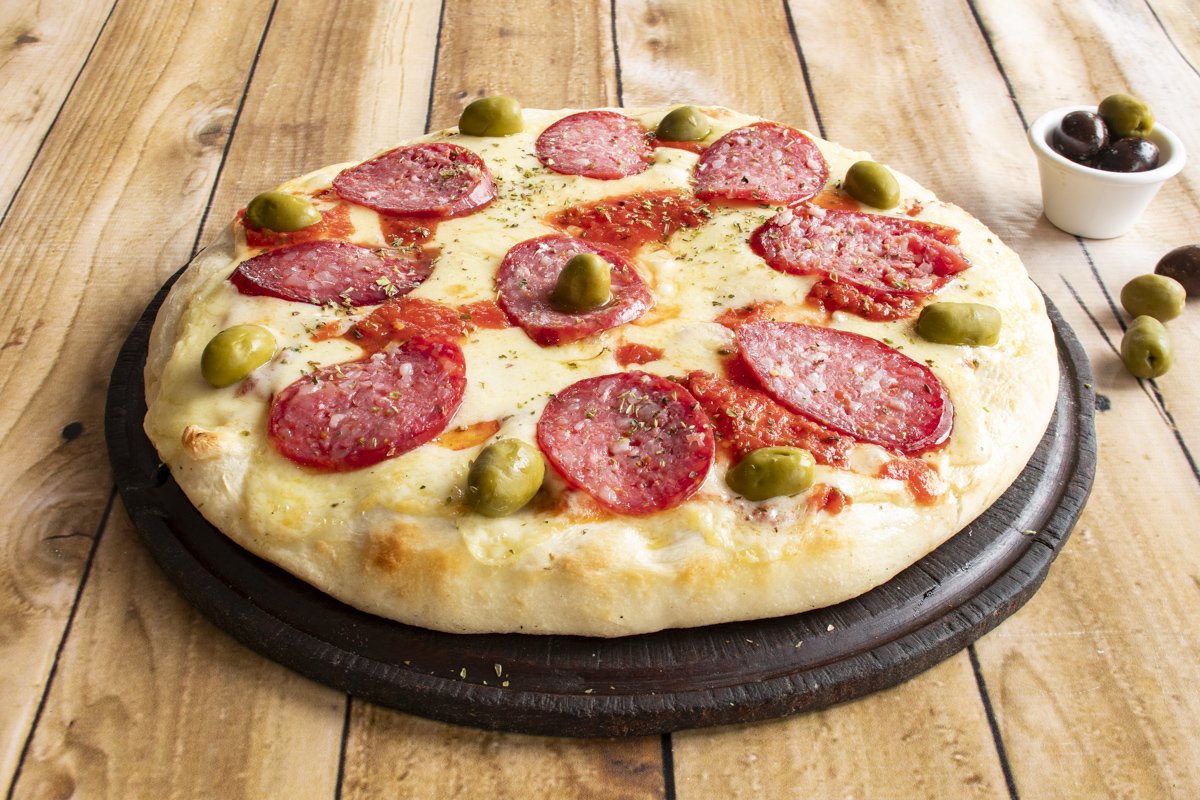 Muzzarella, salsa de tomate, aceitunas, longaniza calabresa y orégano