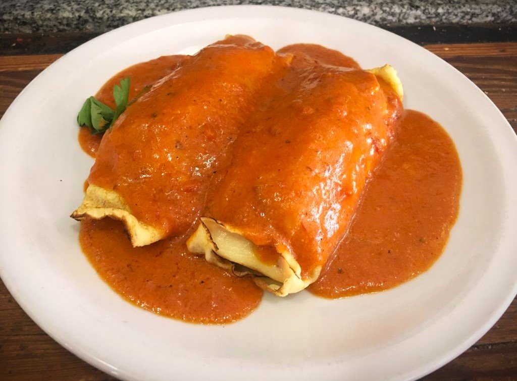 Canelones de verdura, pollo, ricota, jamón, muzzarella con salsa rosa