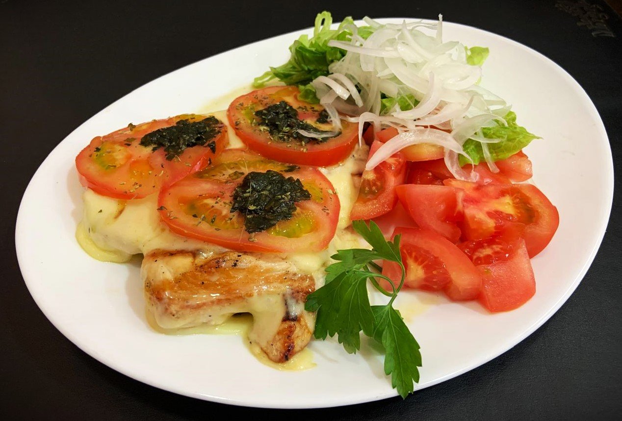 Ensalada de tomate, pollito crocante, zanahoria, crutones con oliva y colchón de rúcula