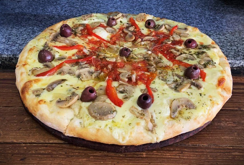Muzzarella, salsa de tomate, champiñón, provenzal, aceitunas verdes