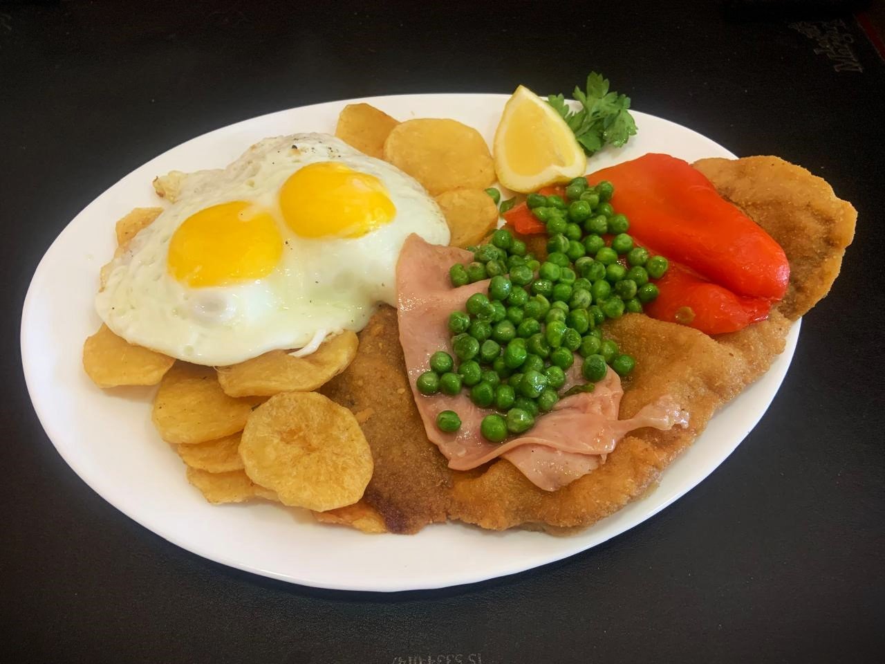 (Jamón, morrón, arvejas, papas fritas y 2 huevos