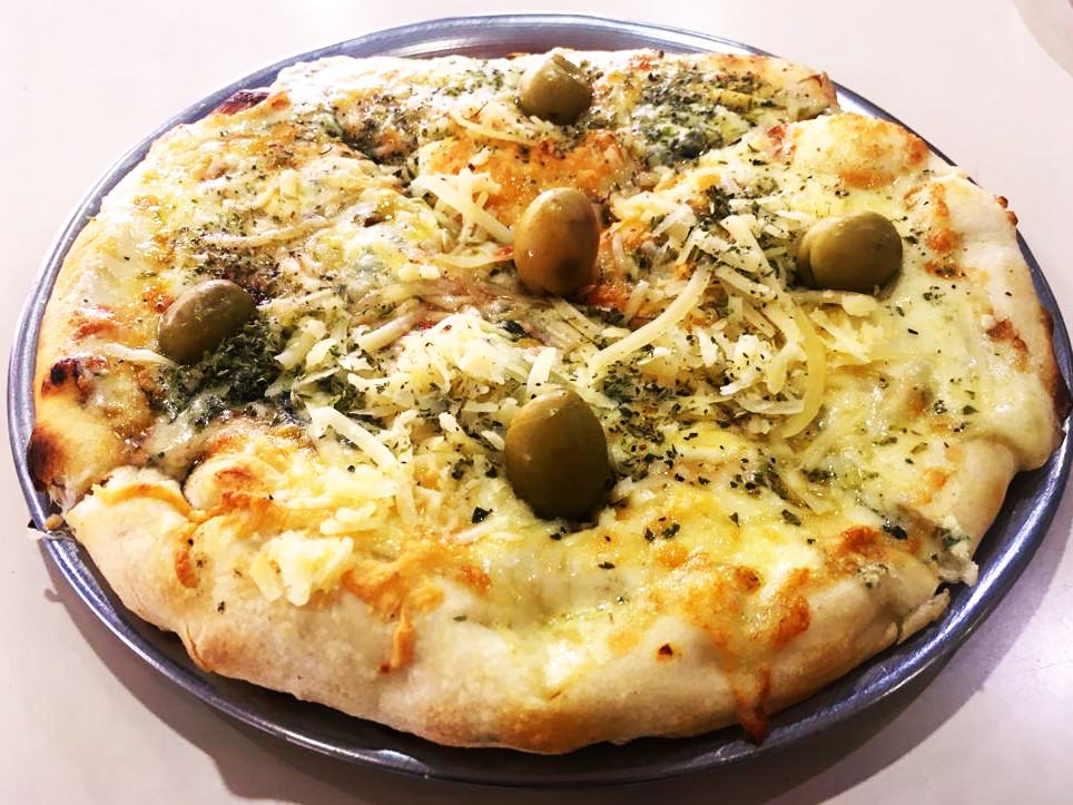 Muzzarella, provoleta, roquefort, provolone, salsa de tomate y aceitunas verdes