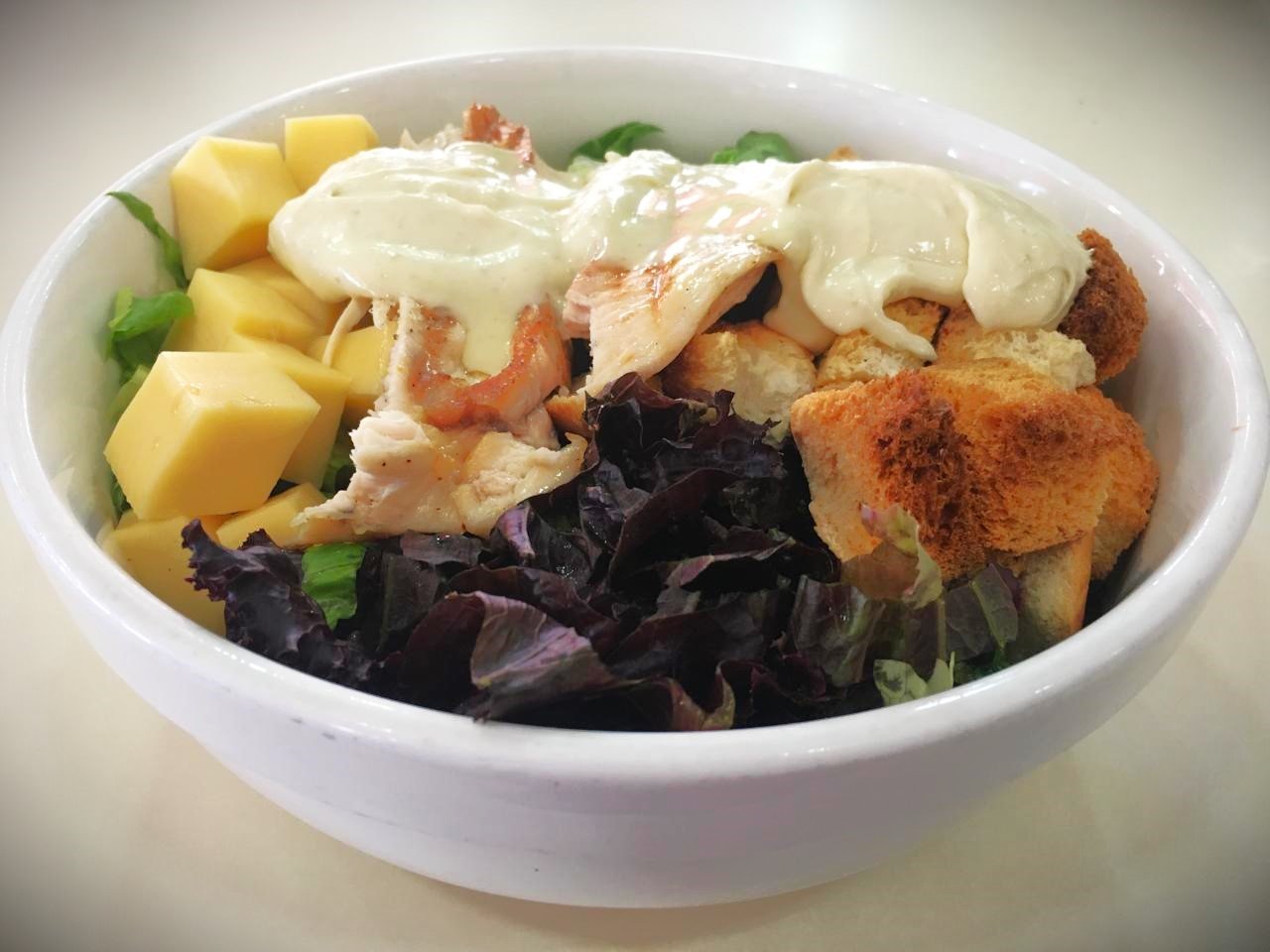 Lechugas verdes, moradas, queso tybo, crutones, pollo y aderezo césar