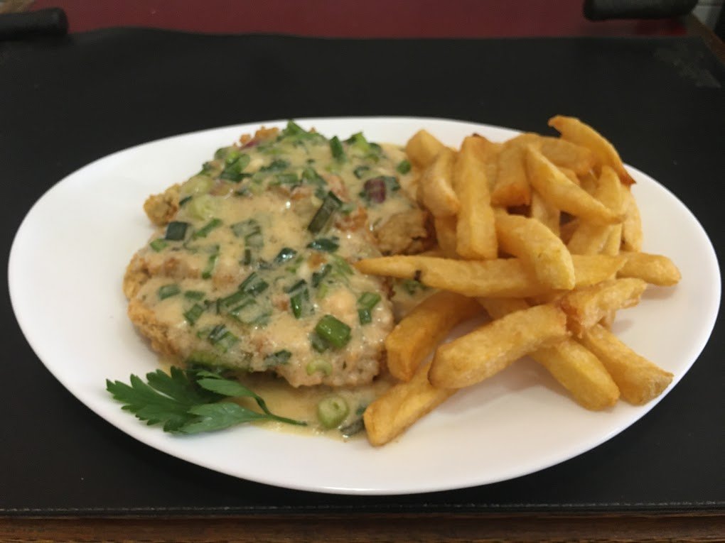 Escalopines de pollo a la crema de verdeo con papas españolas
