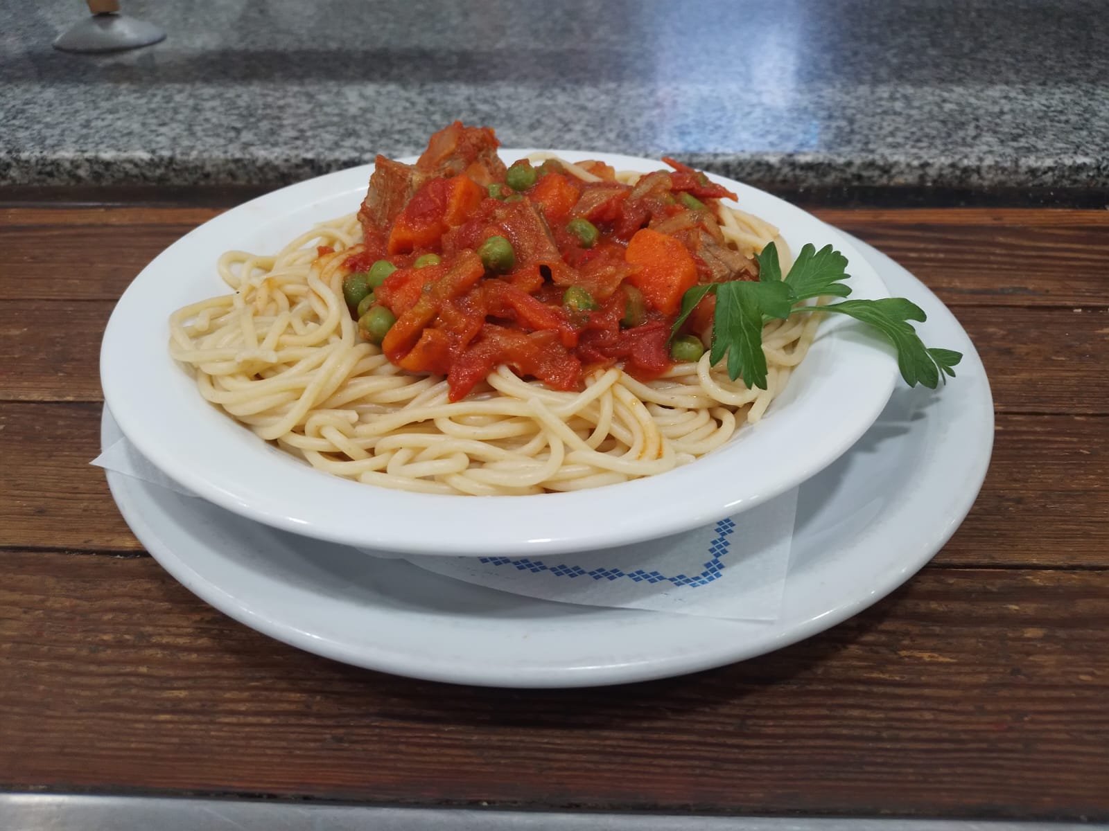 Espaguetis con ragú de ternera (Estofado de zanahoria, cebolla, salsa de tomate y arvejas)