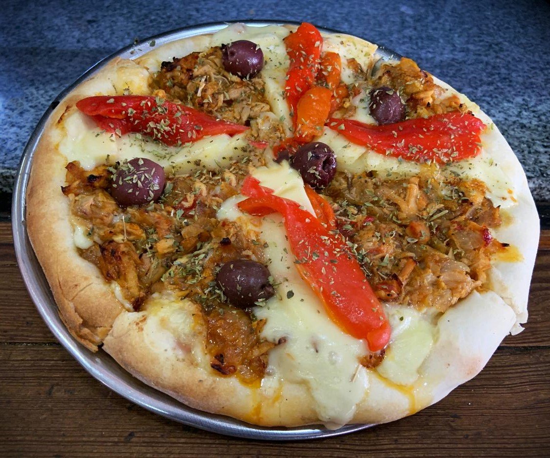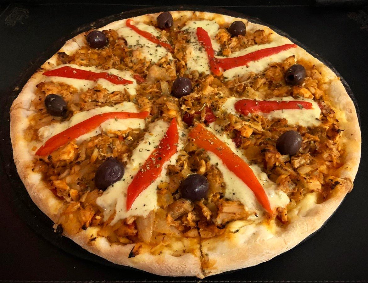 Muzzarella, salsa de tomate, pollo salteado con cebollita y morrón, olivas negras