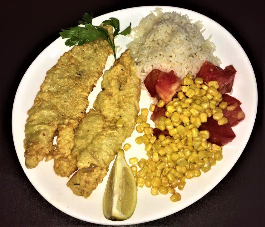Filet de merluza a la romana con ensalada de choclo, tomate y arroz