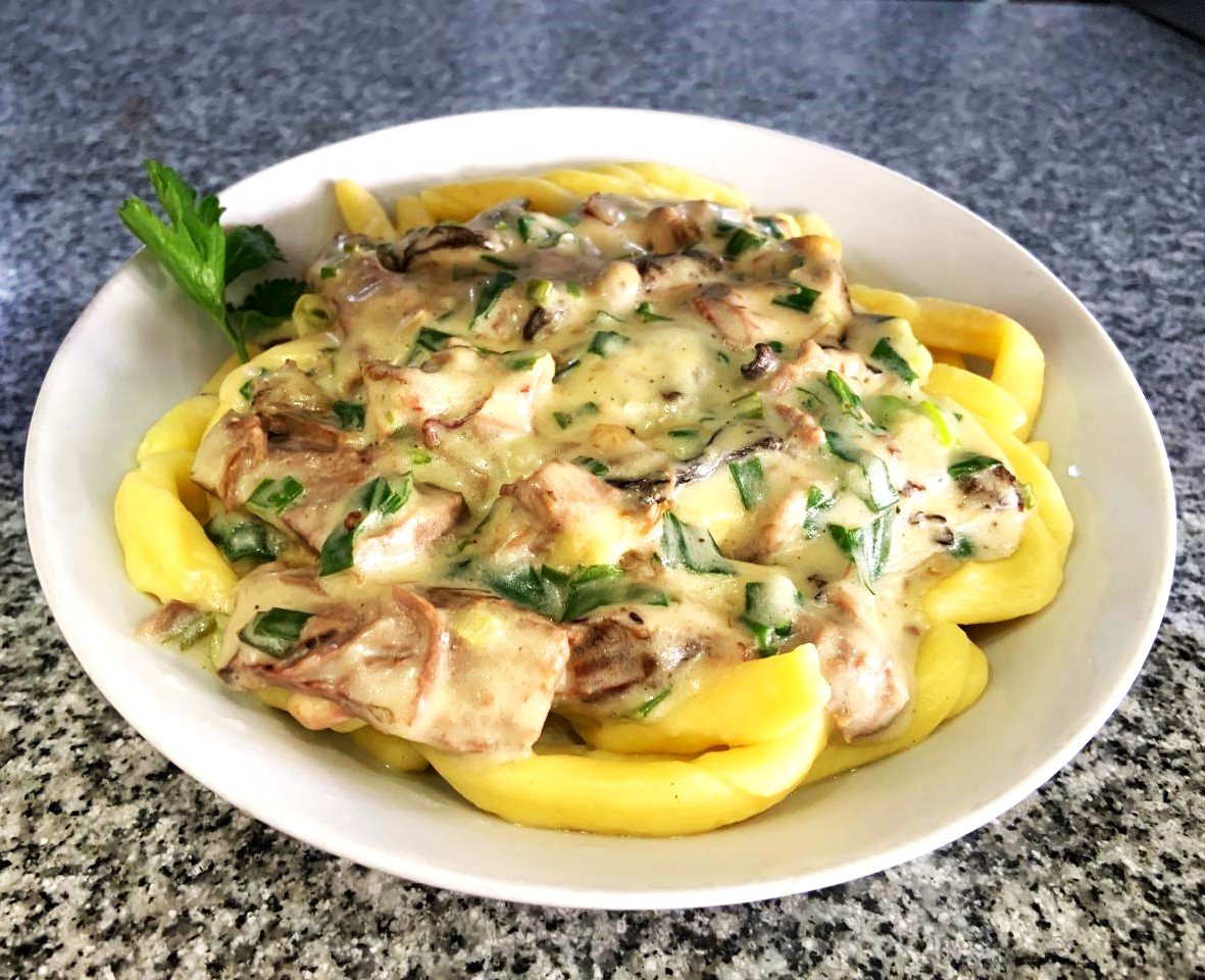 Salsa crema de verdeo, tiritas de lomo y hongos secos