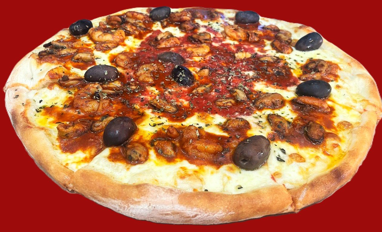 Muzzarella, pimentón, albahaca, ajo, filet de morrón, olivas negras, camarones y mejillones