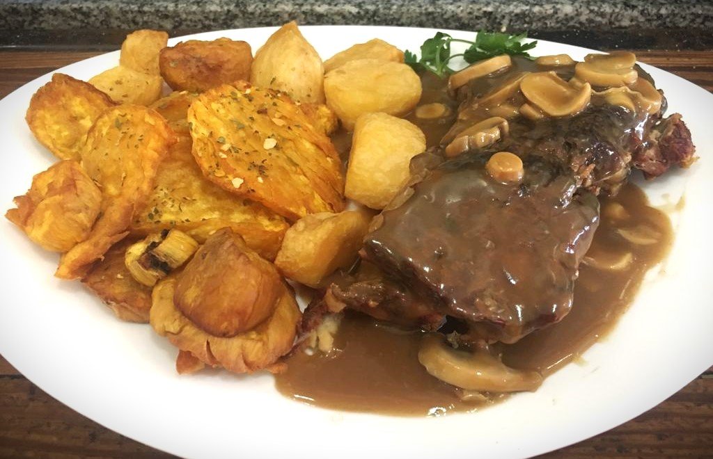 Carne al horno con salsa champiñón, papas y batatas