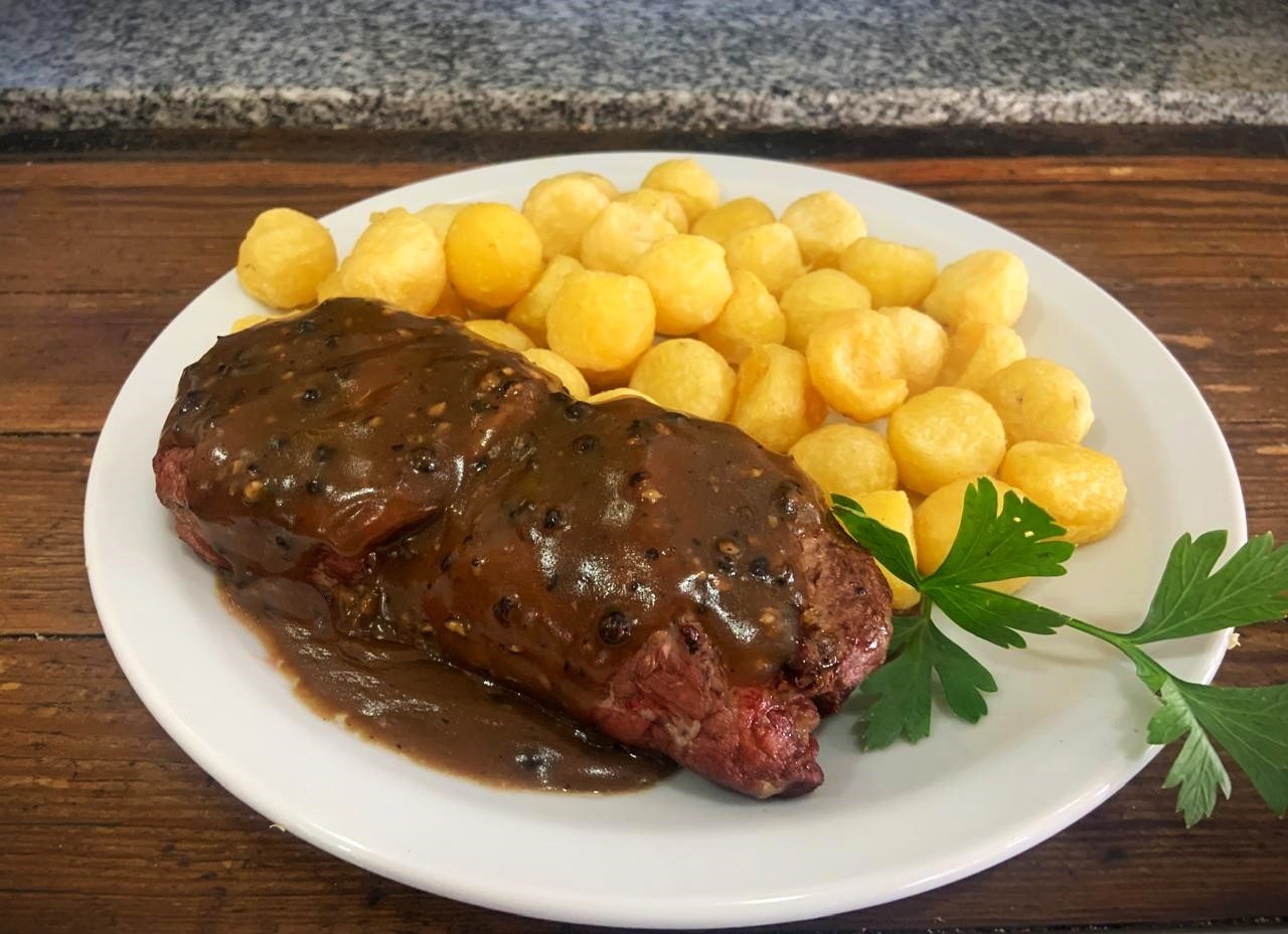 Lomo a la pimienta negra con papas noissette