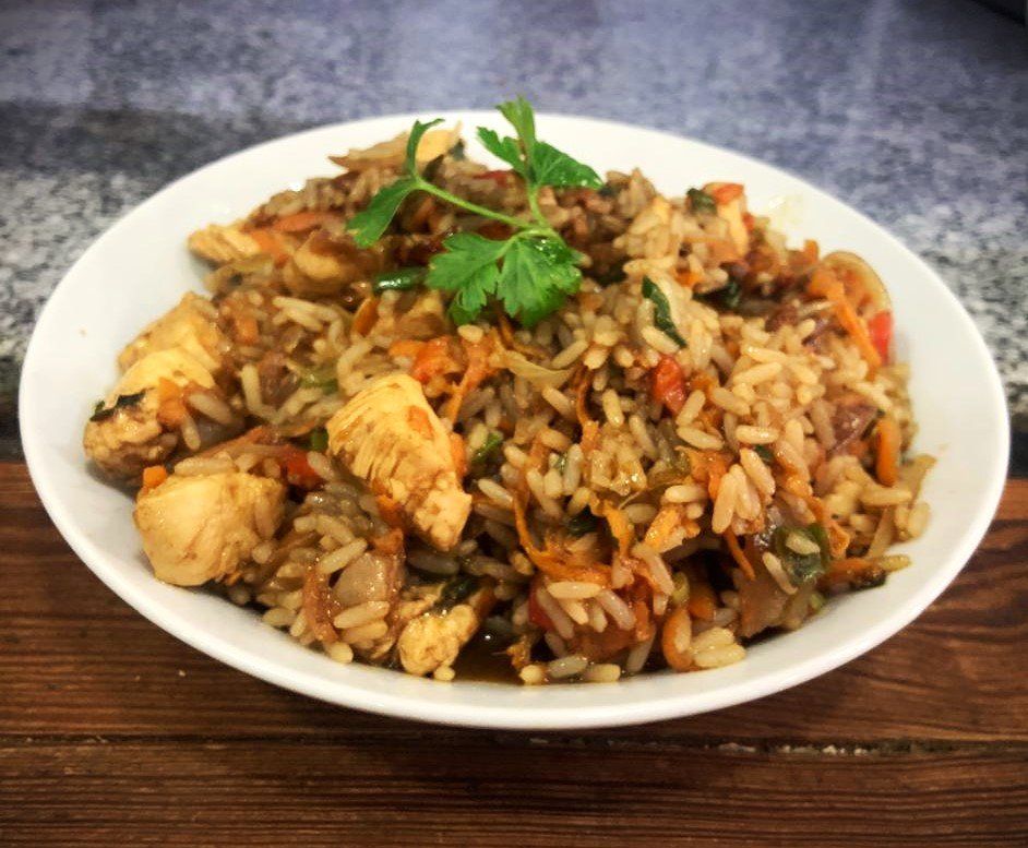 Ensalada de lentejas (Lentejas, arroz, tomate, zanahoria, dados de pollo y filetes de champiñón)