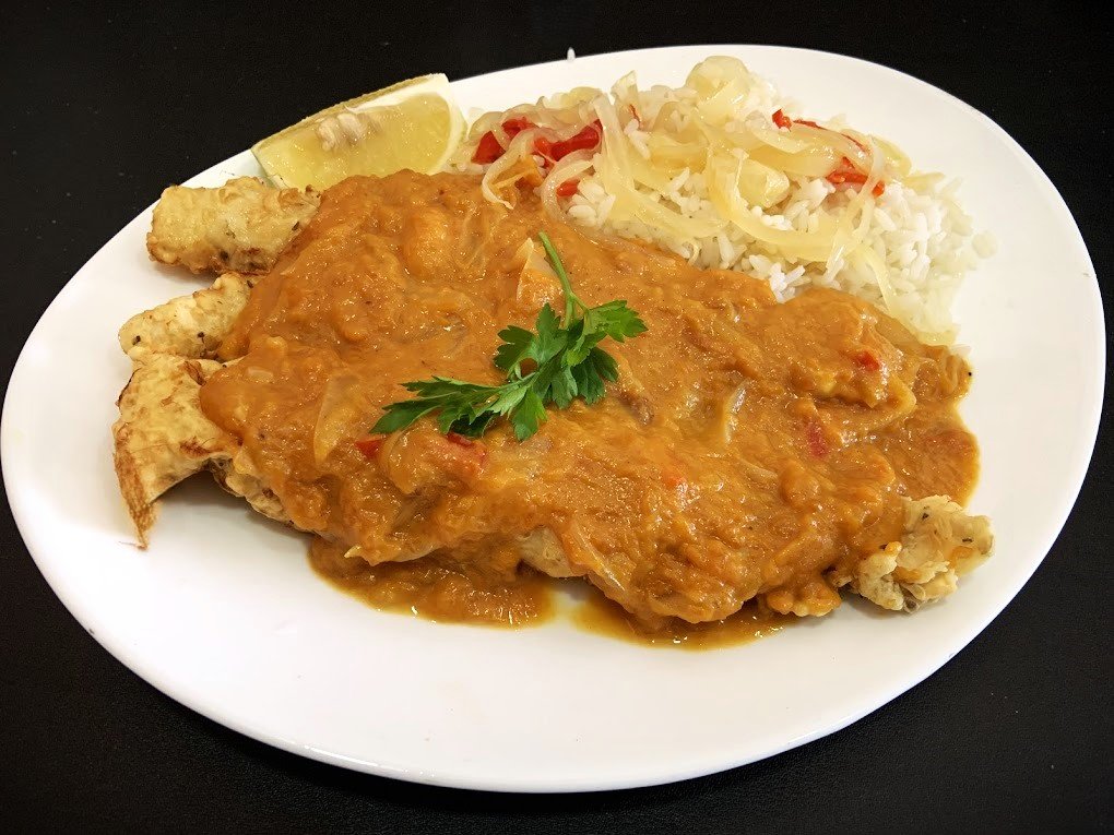Filet de merluza con crema de calabaza, arroz, cebollita y morrón