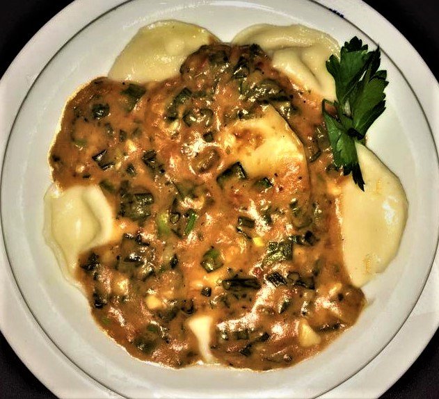 Sorrentinos de jamón y muzzarella con salsa blanca, fileto y verdeo