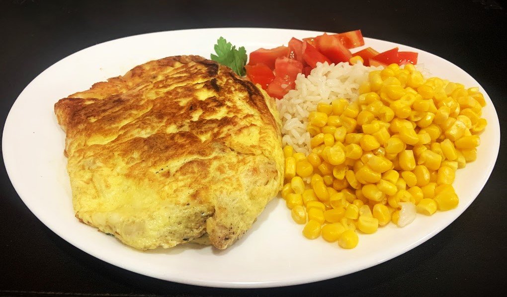 Omelet de jamón, queso, pollo y champiñones con ensalada de choclo, tomate y arroz