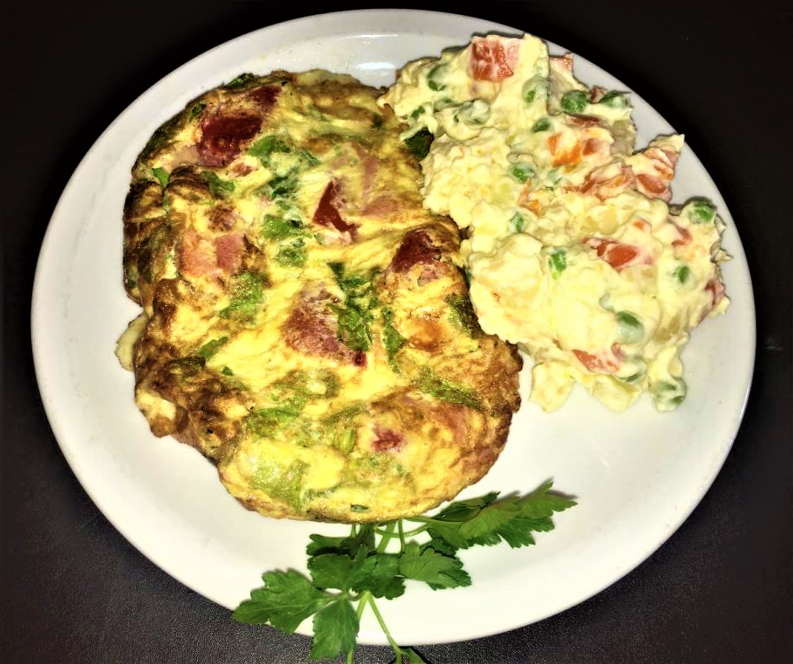 Omelet “Margaritas” (Queso, tomate, jamón, lechuga) con ensalada rusa