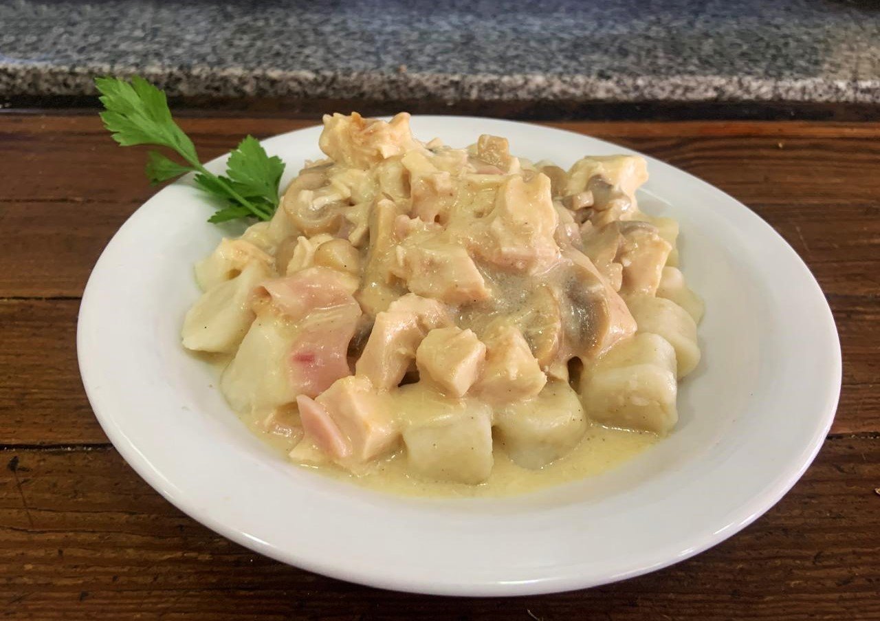 Parisienne: champiñones, jamón, pollo, salsa blanca