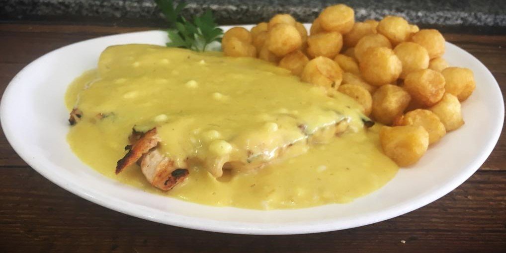 Pollo al la mostaza con papas noisette
