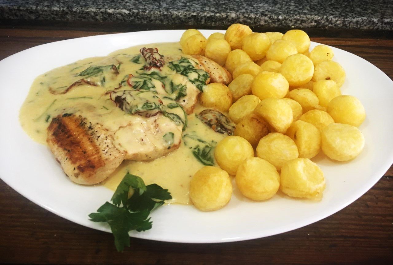 Pollo con salsa crema de rúcula y tomates secos con papas noissette