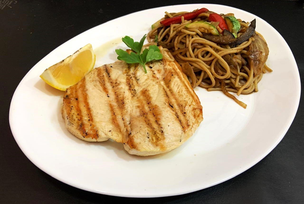 Pollo grillado con espaguetis salteados, verdura y salsa de soja