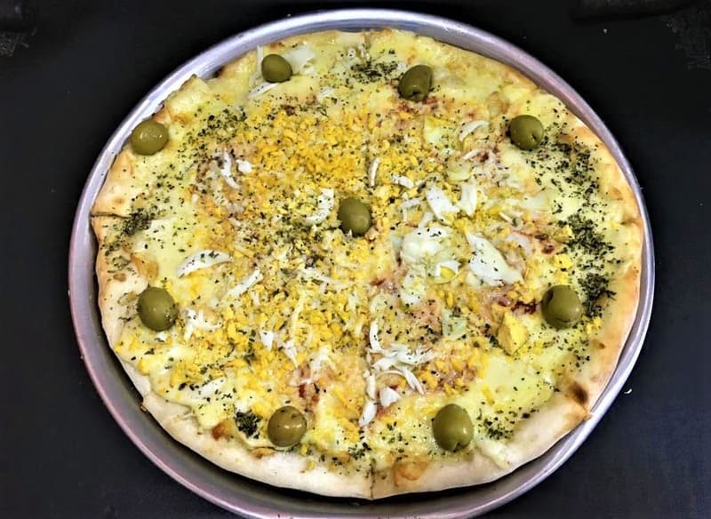 Muzzarella, salsa de tomate, huevo duro picado, aceitunas y orégano