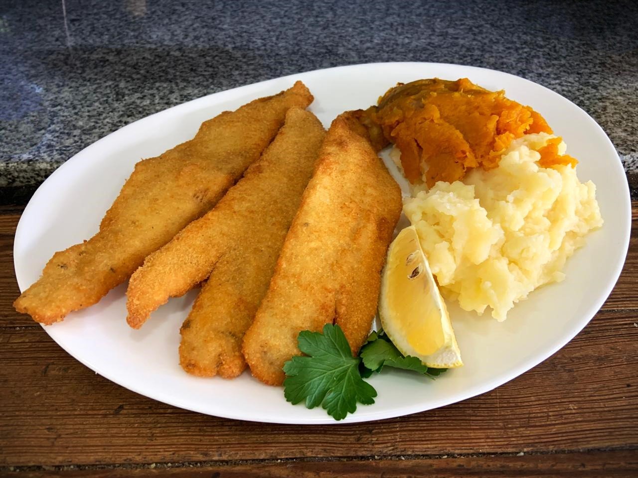 2 porciones de filet de merluza a la milanesa con puré de papas