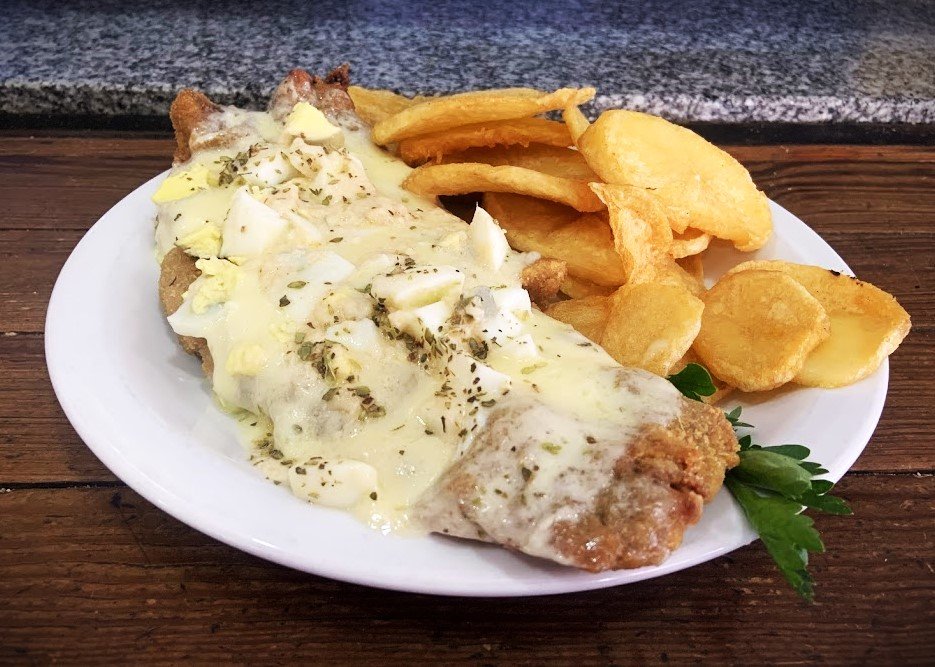 2 PORCIONES DE MILANESA DE TERNERA A LA SUIZA CON PAPAS ESPAÑOLAS