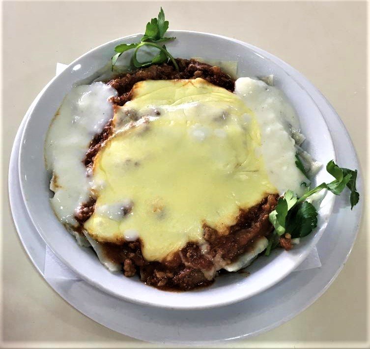 Lasaña rellena de carne, verdura, jamón y muzzarella con salsa rosa