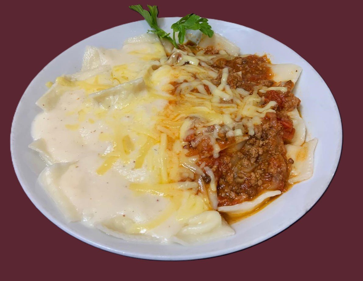 Ravioles de verdura o ricota con salsa blanca, boloñesa y parmesano