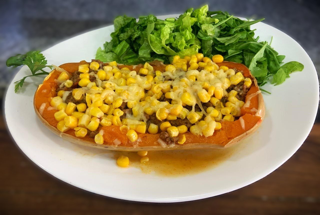 Calabaza rellena al gratén con ensalada de hojas verdes (Carne picada sazonada, cebolla, morrón, granos de choclo y parmesano gratinado)