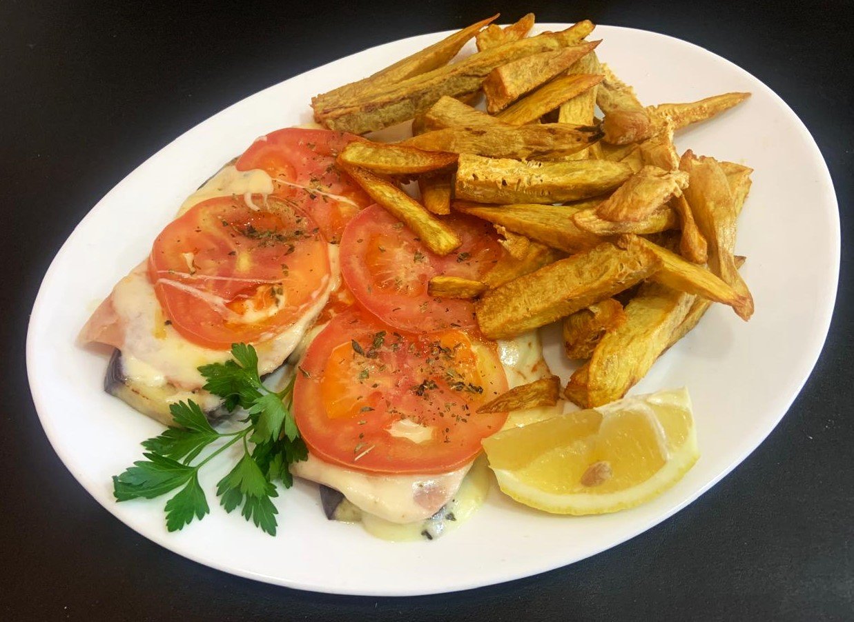 Berenjenas a la napolitana con batatas fritas