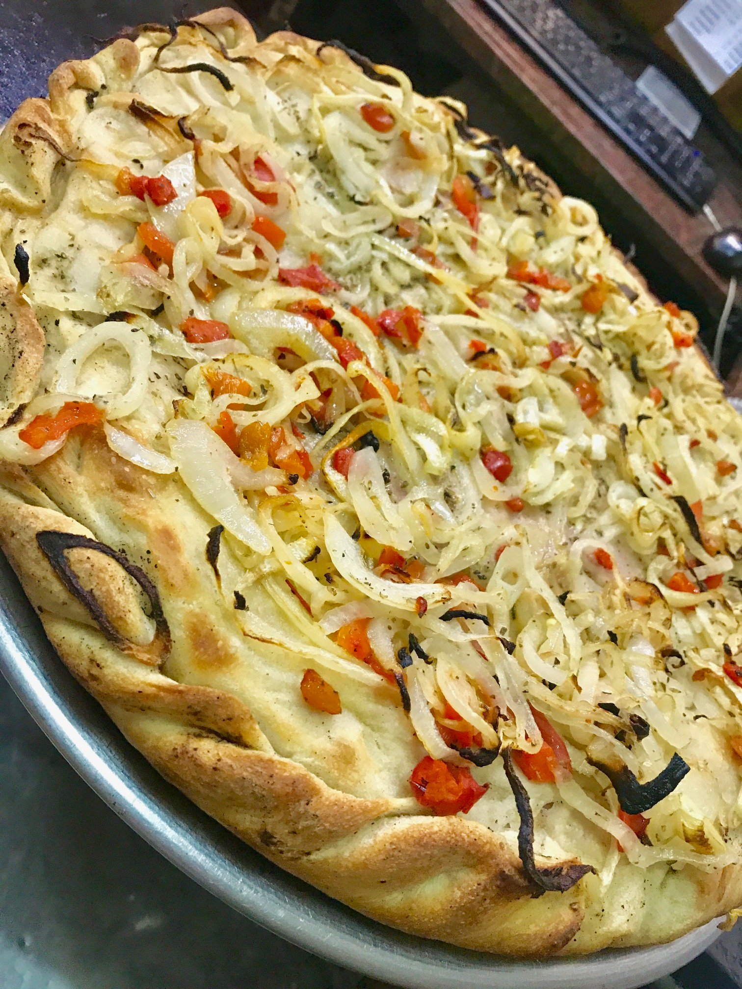 muzzarella, jamón, morrón, cebolla y orégano