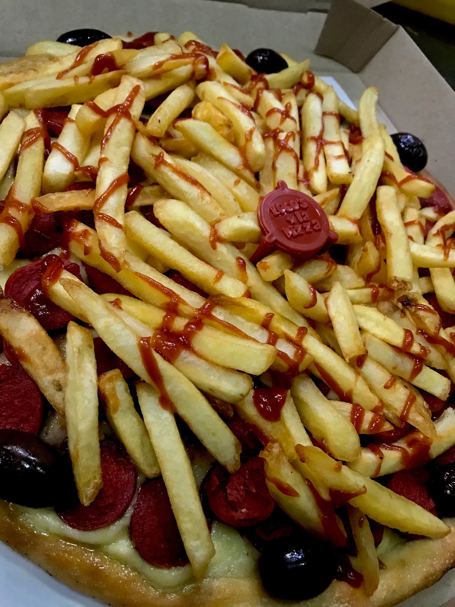 Pomodoro, muzzarella, salchicha, papas fritas y ketchup