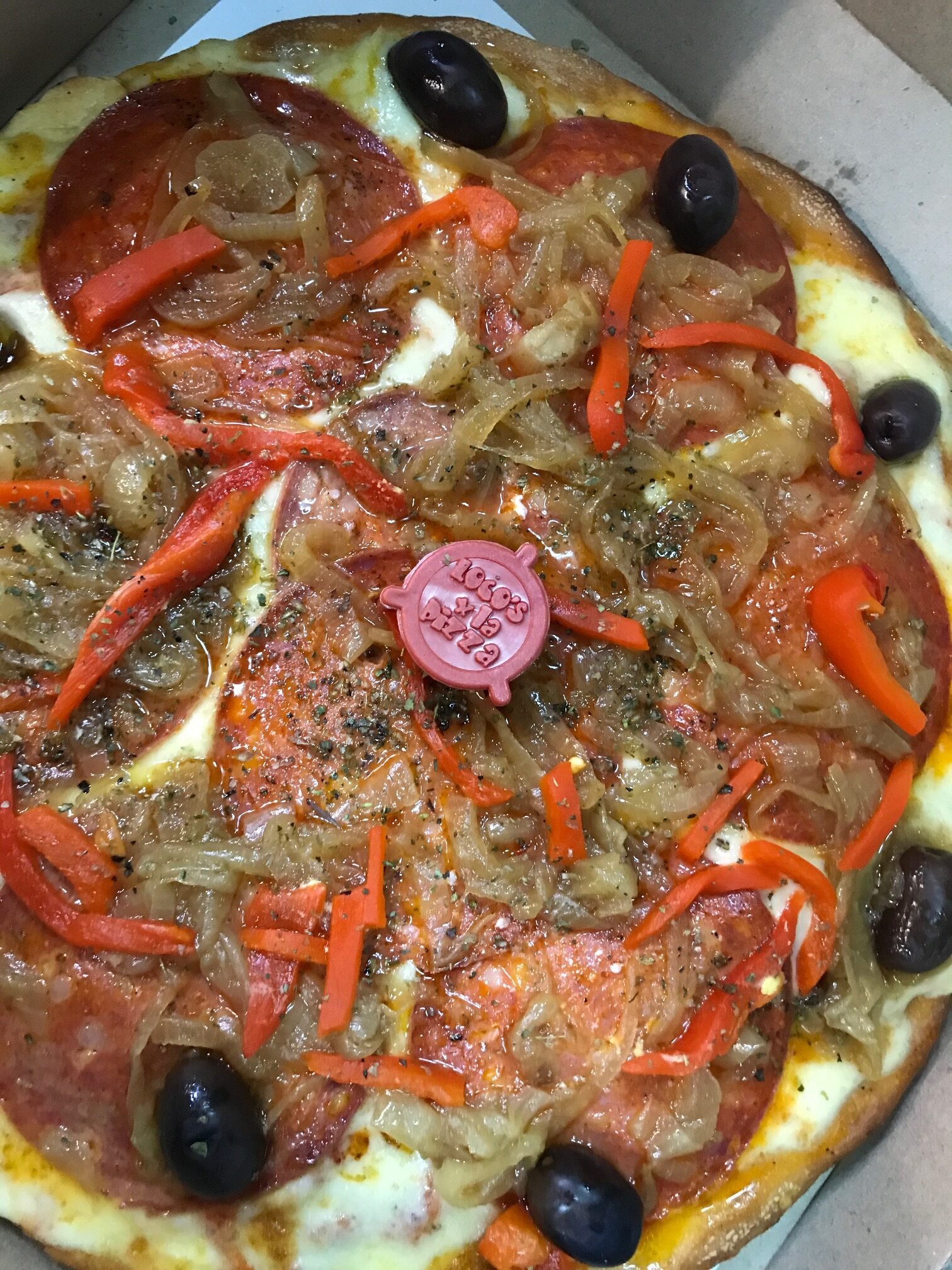 Pomodoro, muzzarella, cantimpalo, cebolla y morron salteada, oregano y aceitunas negras