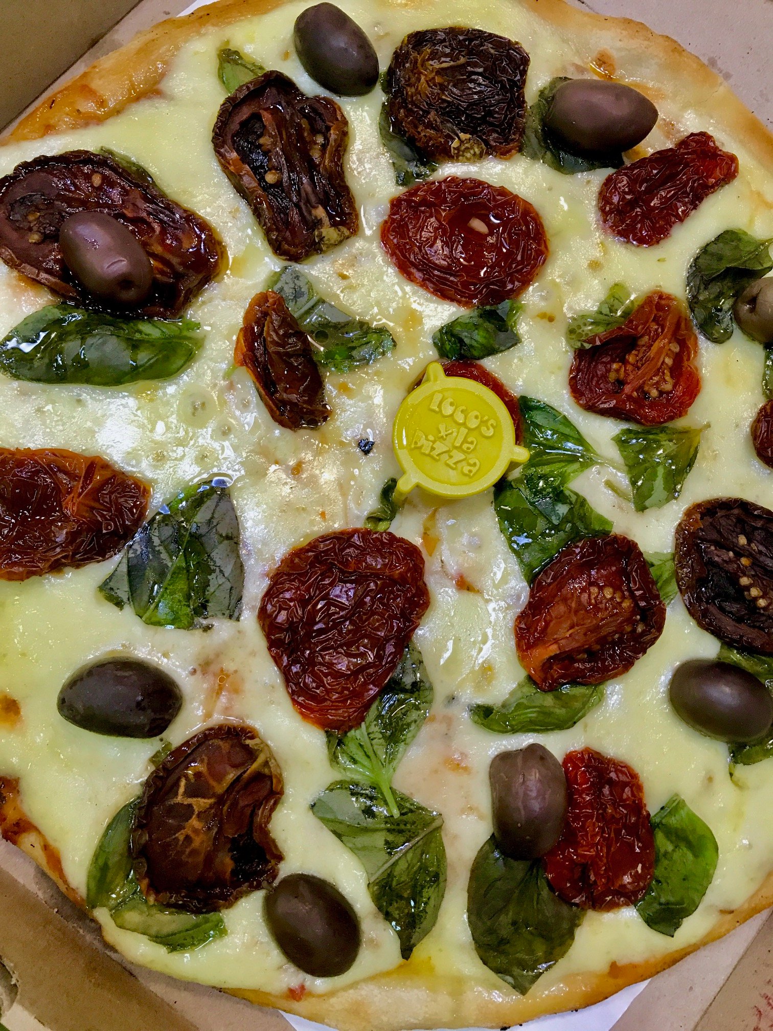 Pomodoro, muzzarella, tomates secos, albahaca, oliva y aceitunas negras
